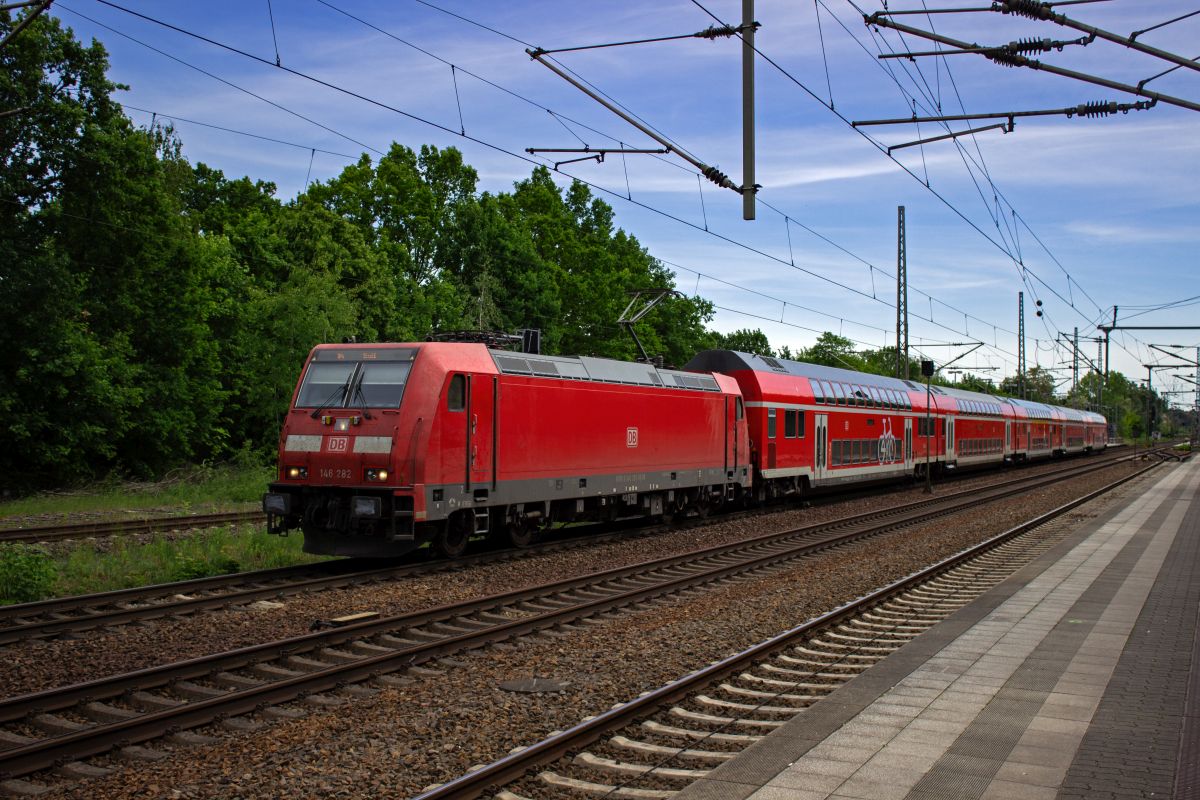 Eine Matisa-Stopfmaschine der Firma Strabag ist zur Überholung durch Fernverkehrszüge auf das Ausweichgleis im Bahnhof Ludwigsfelde geleitet worden und rollt nun auf das Ausfahrsignal zu. Die Besatzung freute sich offensichtlich über die Aufmerksamkeit des Fotografen und grüßte mit ausgiebiger Nutzung des Makrophons. Leon Rosendahl