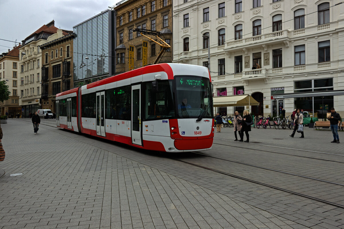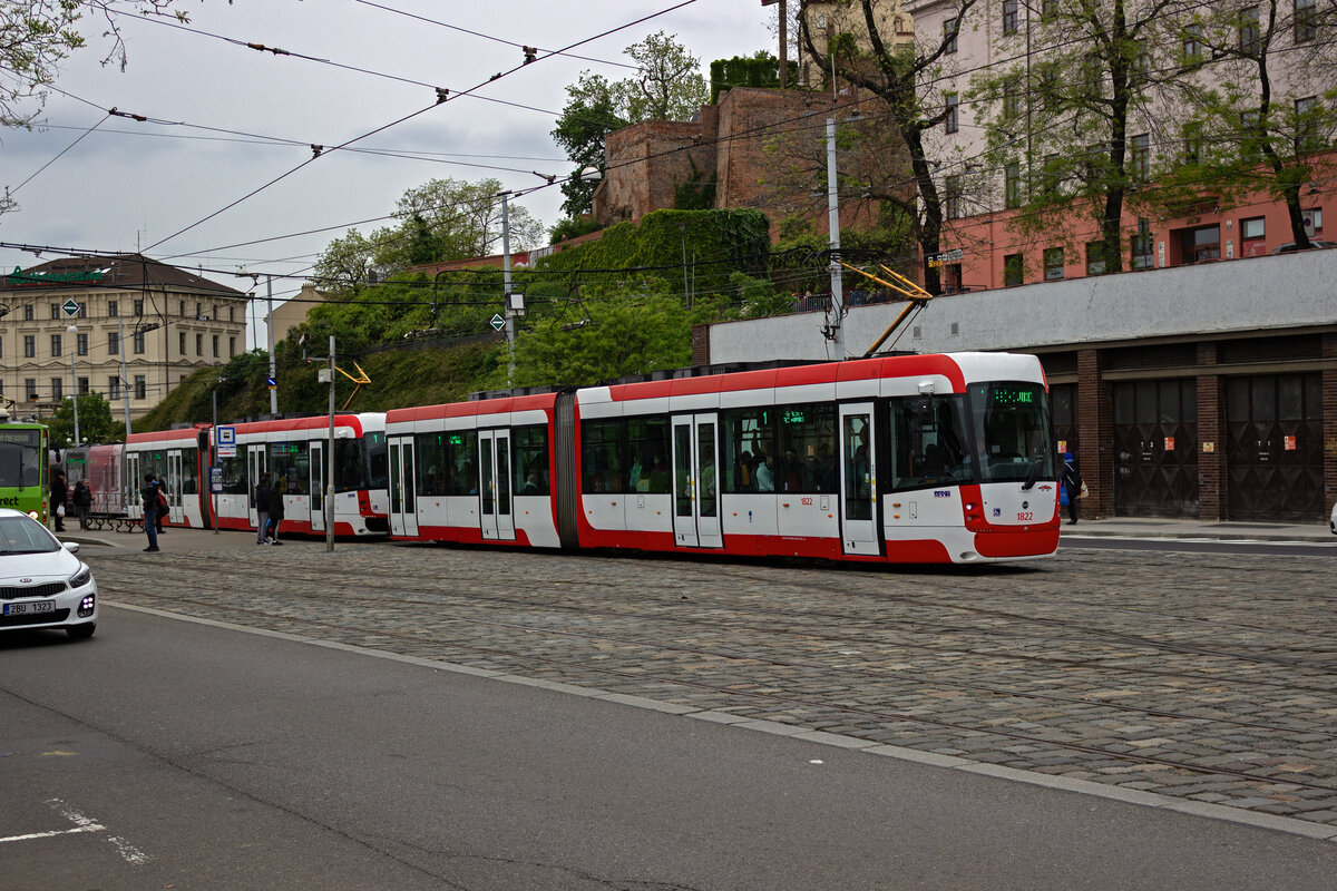 Im südtschechischen Brno besteht ein ausgedehntes Straßenbahnnetz, auf dem verschiedene Fahrzeugtypen aus tschechischer Produktion unterwegs sind. Neben den bekannten Tatra-Fahrzeugen finden darunter auch Neubauten, wie diese Triebwagen vom Typ EVO2 der Firma Pragoimex. Die TW 1822 und 1825 sind am 24.04.2024 auf der Linie 1 in der Nähe des Hauptbahnhofs unterwegs in Richtung Řečkovice. Leon Rosendahl