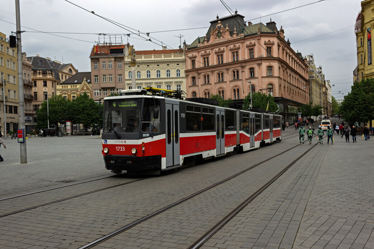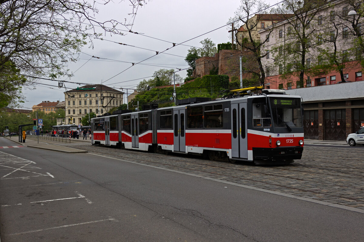 Eine Brünner Besonderheit sind die 7 Triebwagen der Bauart KT8D5N. KT8 mit Niederflurmittelteilen sind keine Seltenheit, allerdings sind die Mittelwagen nachträglich eingebaut worden. Die KT8D5N sind die einzigen Triebwagen dieser Bauart, die ab Werk teilweise niederflurig ausgeführt waren. TW 1735 ist auf der Linie 8 unterwegs in Richtung Bohunice. Leon Rosendahl