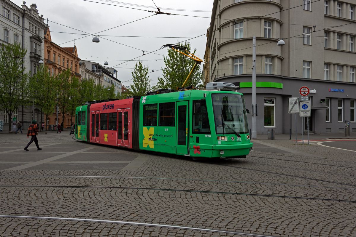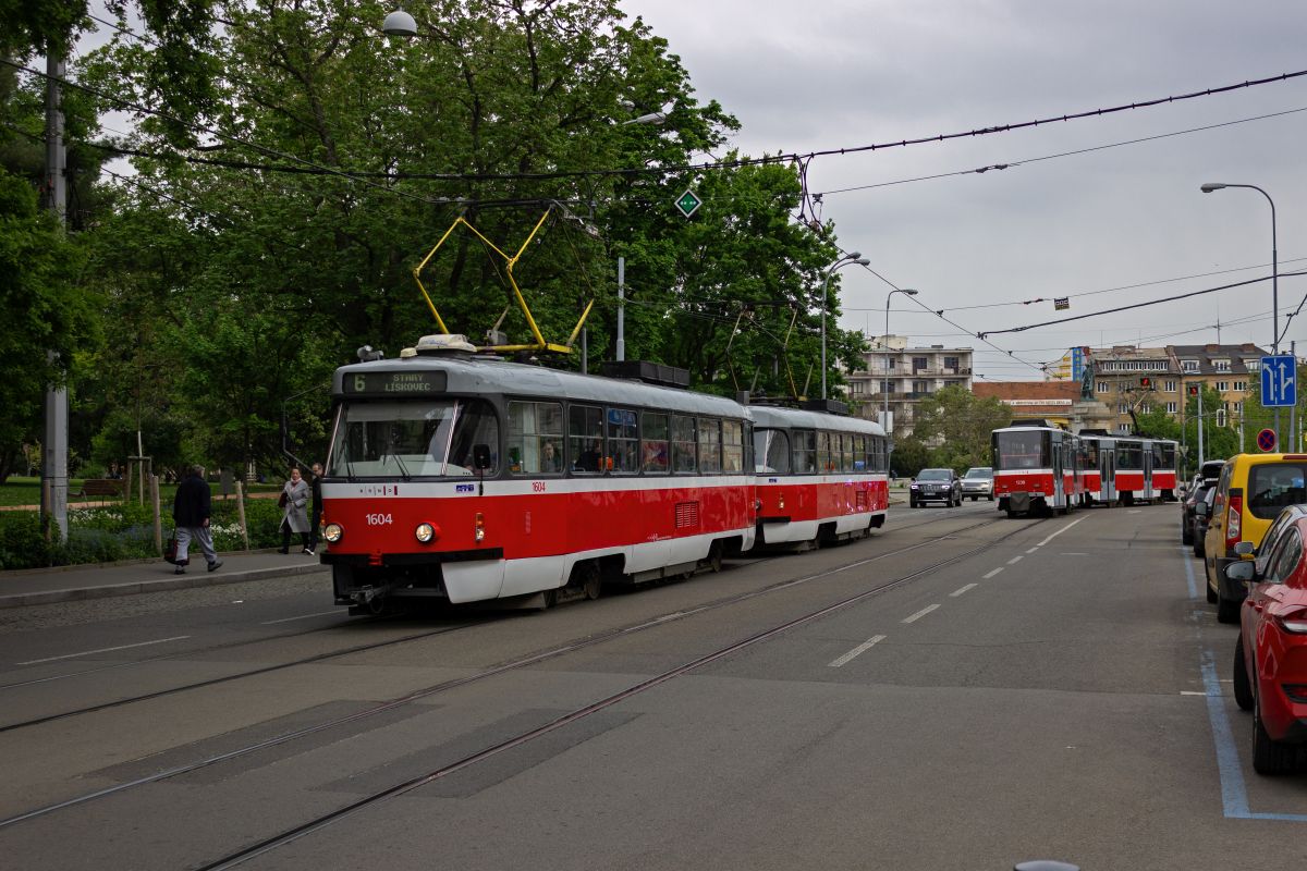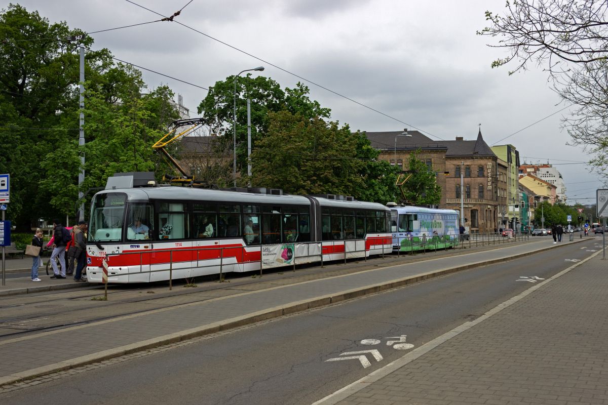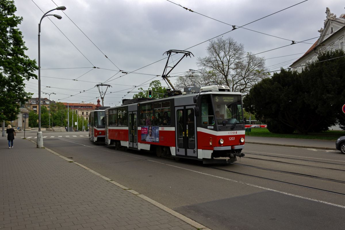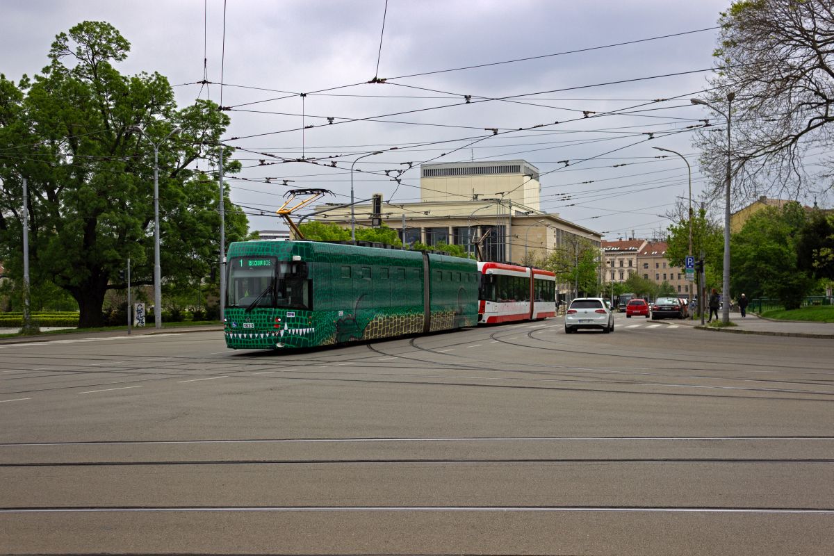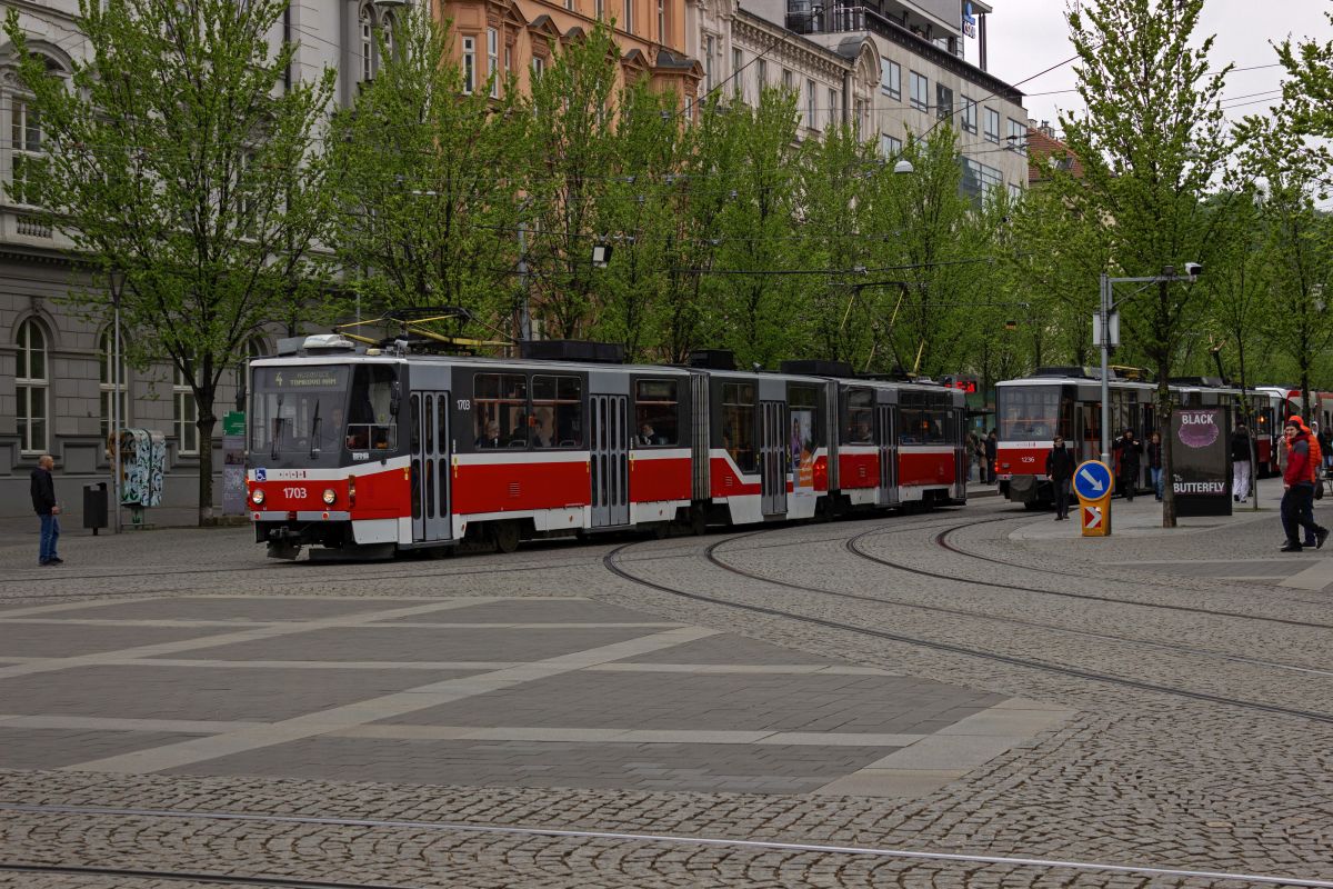 tatra-kt8d5rn2-3/901929/der-kt8d5-1703-auf-der-linie Der KT8D5 1703 auf der Linie 4 in Richtung Tomkovo náměstí verlässt die Haltestelle Česká.22.11.2025 Der KT8D5 1703 auf der Linie ...